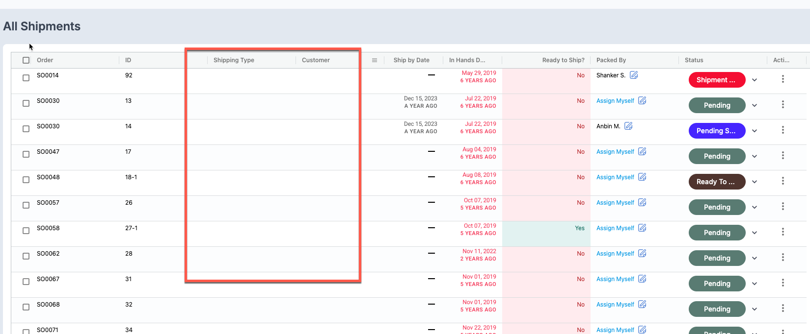 Shipment List Page: Shipping Type and Customer Shows Empty