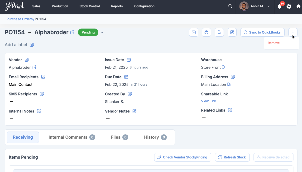 Purchase Order Detail Page: Remove Option Is Missing