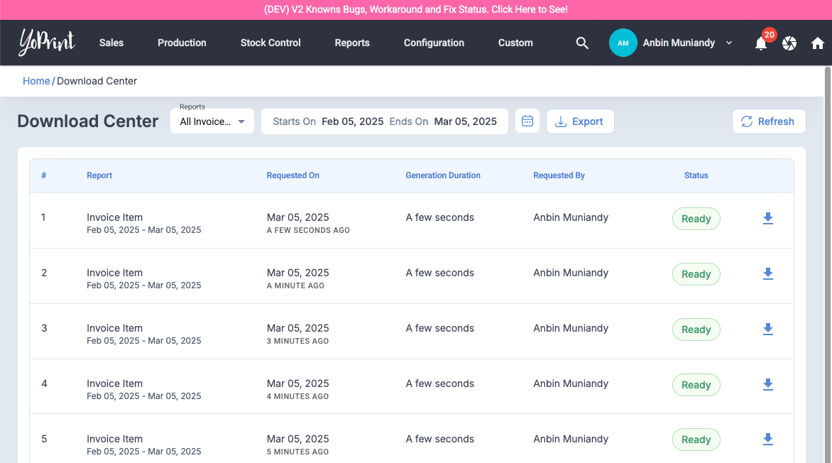 Download Center: Add Invoice Item Report Export