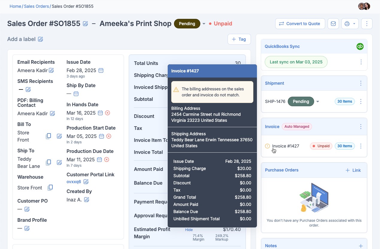 Invoice Popover: Remove Address Mismatch Warning