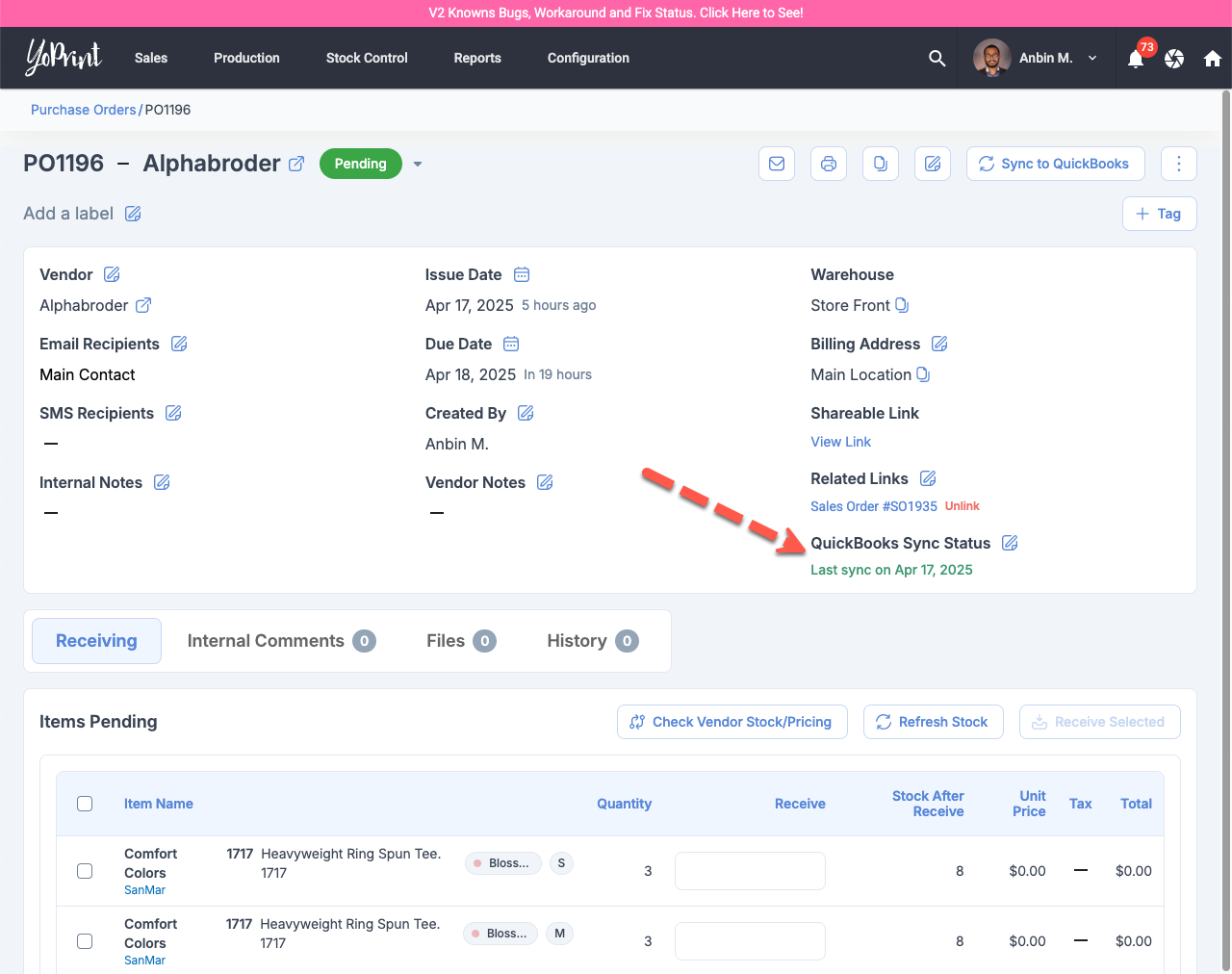 Purchase Order QuickBooks Sync Status