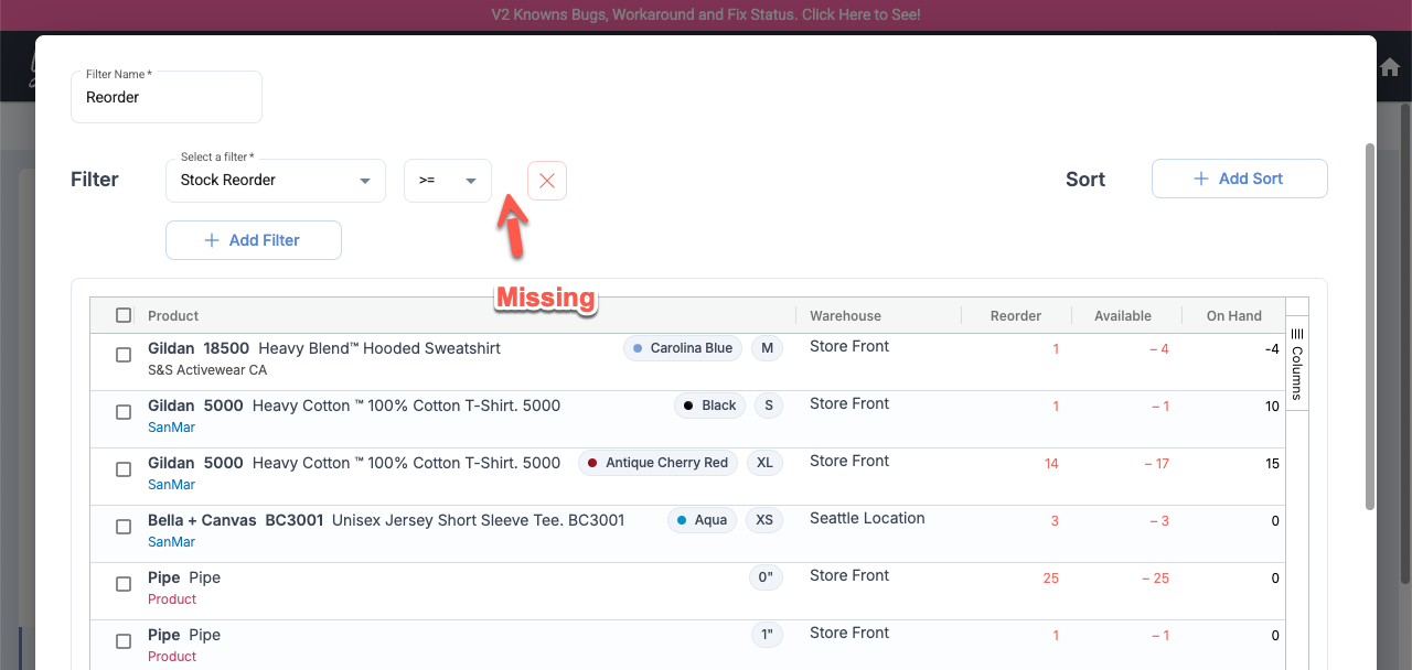 Inventory Saved Filter: Inventory Count Filter Options Not Working