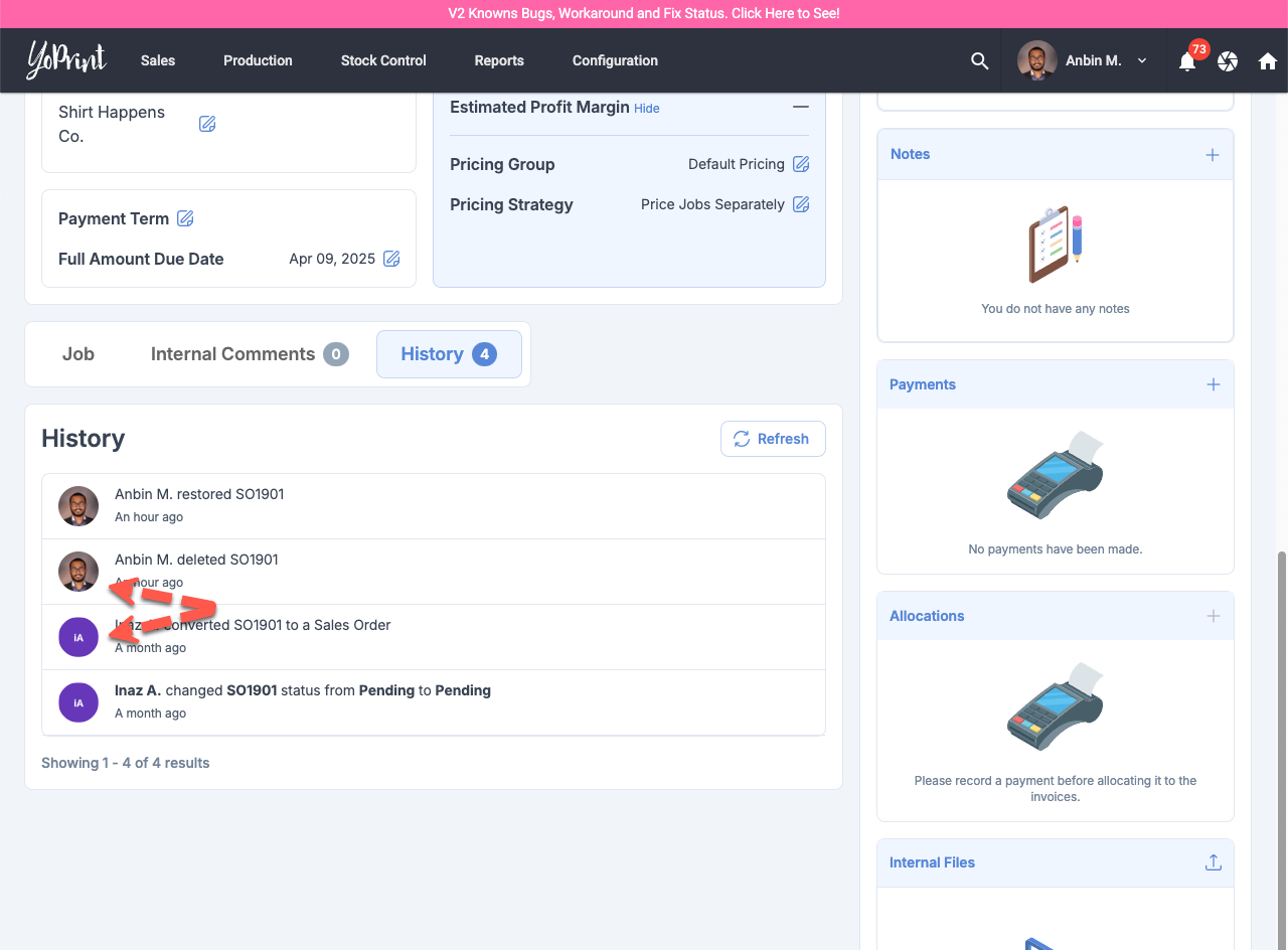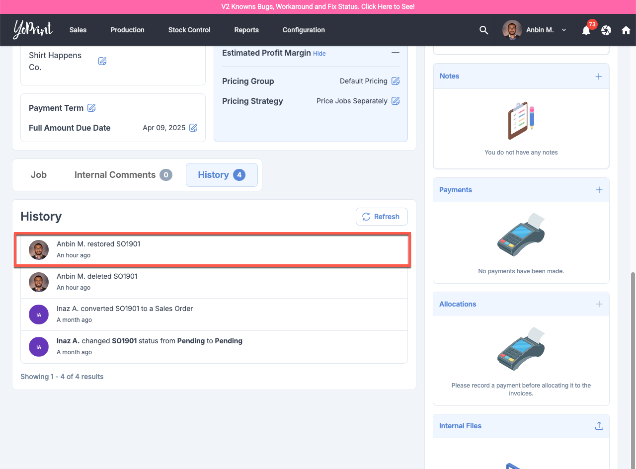 With V2, we've introduced the ability to Restore a Sales Order as opposed to just cloning a deleted Sales Order. With that, we're also adding a new history entry to indicate who restored the Sales Order.