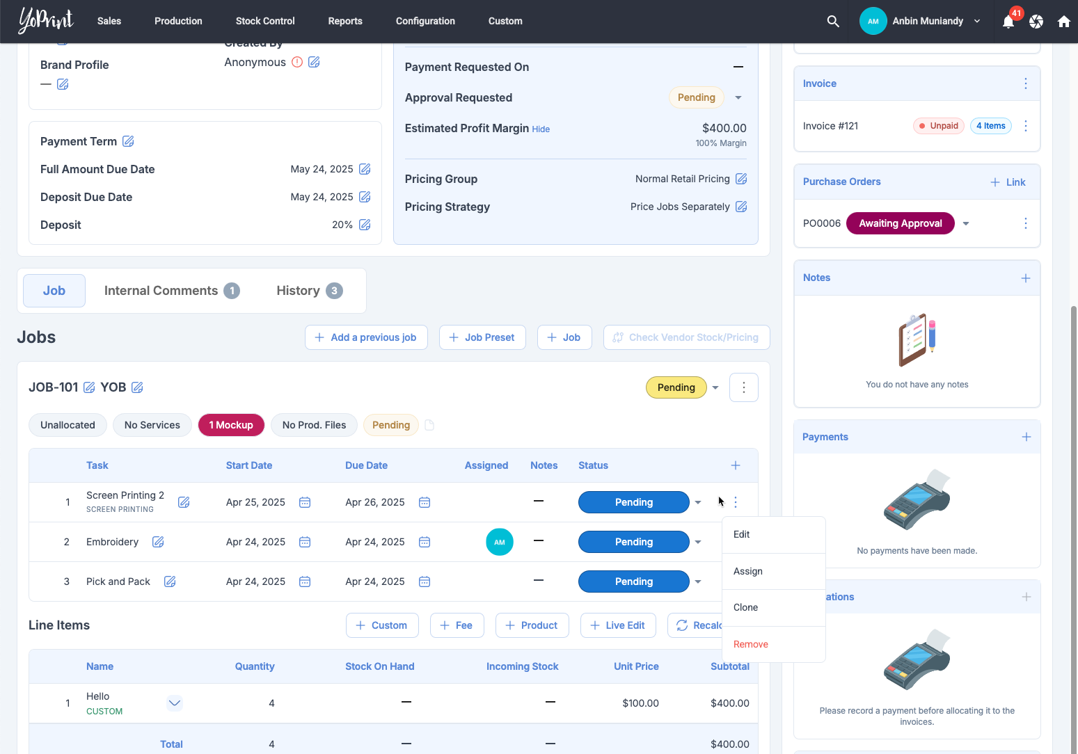 When cloning a Sales Order that has Auto Managed Invoice, YoPrint is mistakenly creates two Invoices. This has been fixed now.
