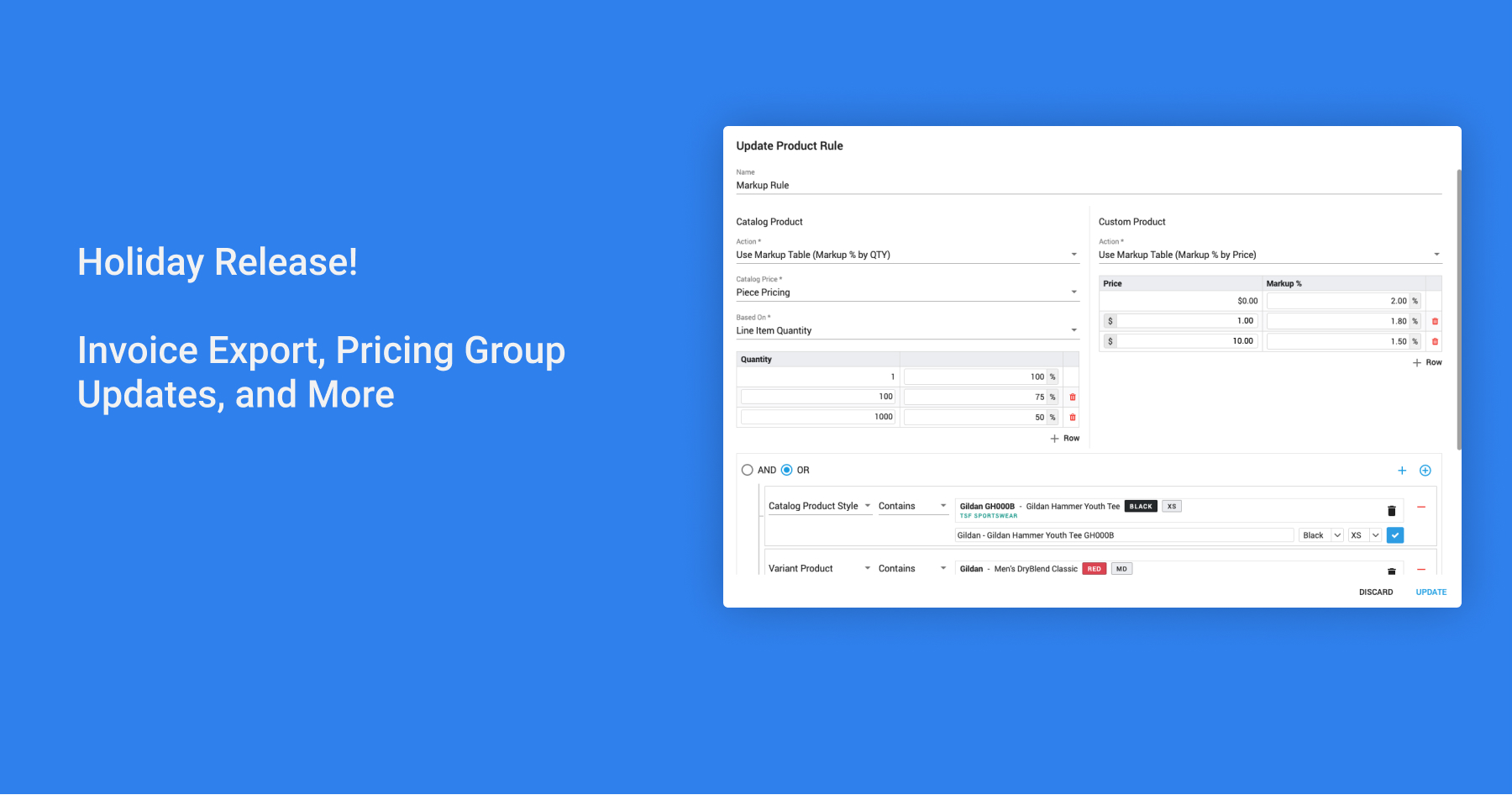 Perhaps you have specific products that you charge differently. You would like to keep your best selling product price the same regardless of the order quantity, or you may be running a special promo on certain items offering a substantial discount. No matter the business need, with our new product-specific rules, you can accomplish just that.