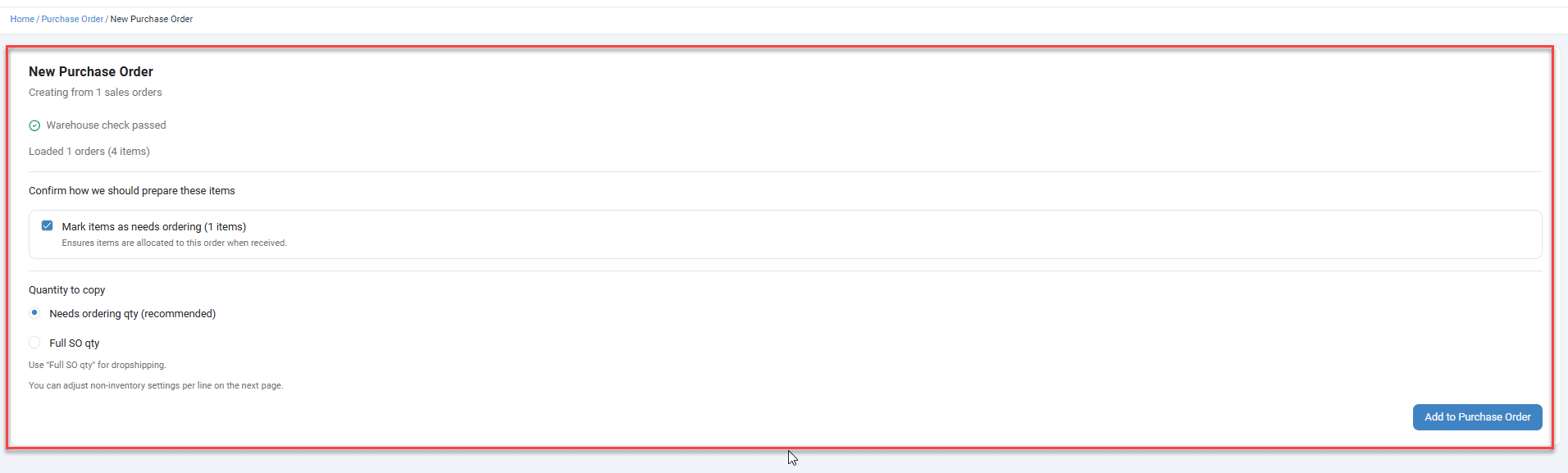 Creating a purchase order from sales orders now uses a step-by-step setup flow. When you generate a PO from one or more sales orders, the page guides you through warehouse verification, data loading with per-order progress, and configuration options (such as marking items as needs ordering, including customer-supplied items, and choosing the quantity source) before building the item list. The new process handles large orders more reliably by running calculations in the background and showing clear status updates for each sales order, with options to retry failed loads or continue without them.