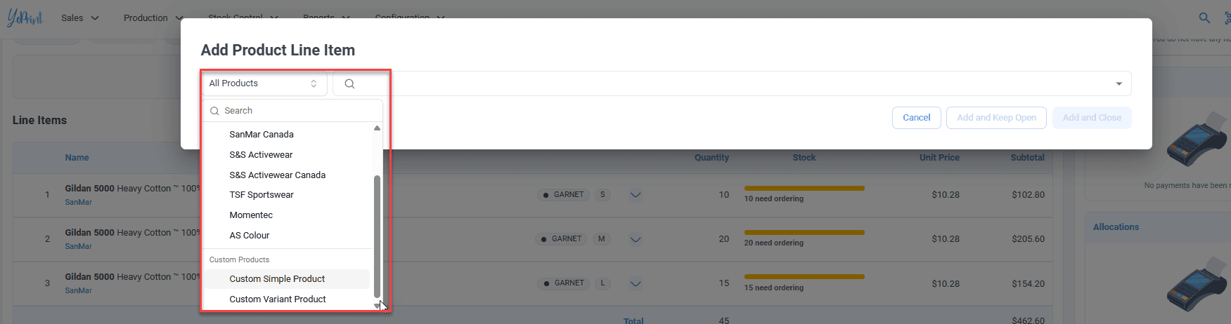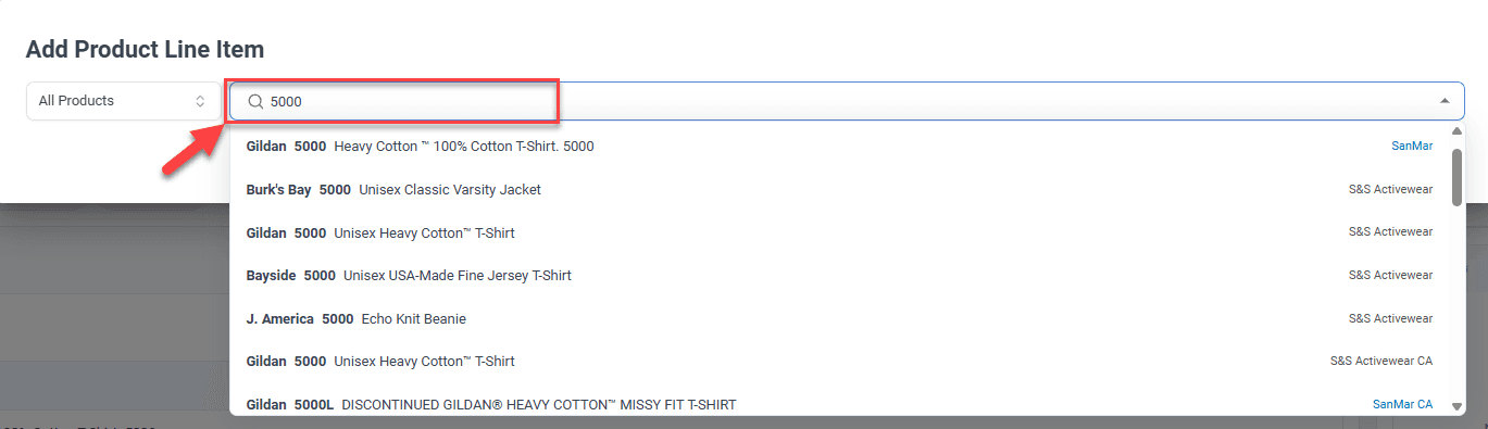You can now filter products by type when adding items to a Sales Order. A new Product Type dropdown lets you quickly narrow results to Custom Simple, Custom Variant, or specific catalog suppliers like SanMar, S&S Activewear, and AlphaBroder.